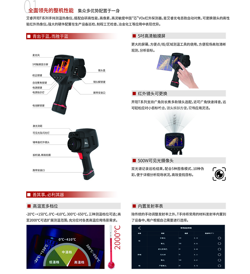 近日,艾睿依托自身在非制冷红外芯片领域强大的技术实力和量产能力,不断探索、推陈出新,以技术+市场双驱动,持续引领整个行业前进,推出了首款自动对焦、可更换镜头的高性能红外热像仪“开阳”T系列:384×288 / 640×512高红外分辨率,从广角到长焦多镜头可选,全自动对焦系统,高至2000℃可选扩展测温范围,充分满足更多应用场景测温需求。